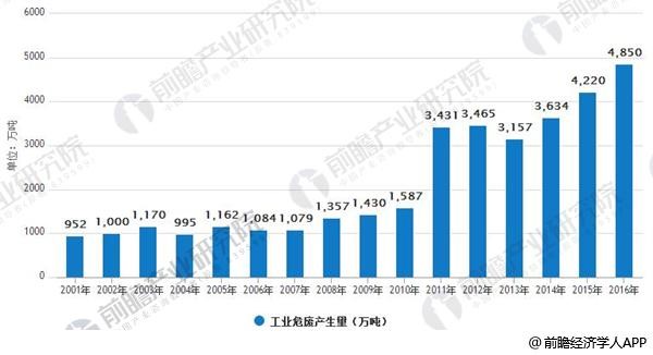 2001-2016年中国工业危废产生量情况