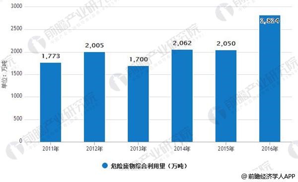 2016年危废综合利用量为2824万吨,同比增长38%